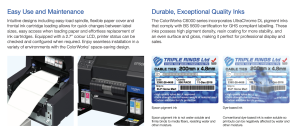- Kedua model ColorWorks pada umumnya menggunakan teknologi tinta pigmen atau formulasi yang dirancang untuk label tahan lama (ketahanan terhadap noda, air, dan sinar) — namun perlu cek spesifikasi tinta masing‑model untuk ketahanan spesifik pada bahan/lingkungan tertentu. Rujuk dokumen produk untuk data ketahanan tinta.