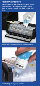 - Fitur yang biasa ditonjolkan: desain tangki terintegrasi, botol tinta berkapasitas besar, borderless printing, dan maintenance box yang dapat diganti.