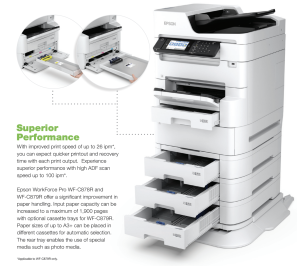 • WF‑C878R menonjol dalam kapasitas kertas total dan dukungan ukuran besar (mis. hingga A3/13×19 dalam beberapa varian WorkForce Pro), serta opsi baki banyak untuk lingkungan workgroup besar.
